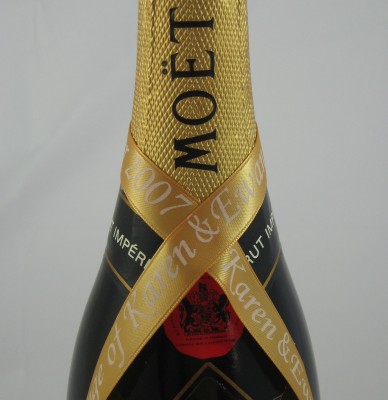 Ideal to put around the neck of champage/wine bottles at the reception or as a thank you message for a bottle gift to anyone in the bridal party. Sorry - bottle not included! Beautiful GOLD 15mm double faced satin ribbon approx 55cm in length in matt white print with wedding rings motif at each end of the ribbon. Priced each - only £1.75 FOR EVERY 5 IDENTICAL MESSAGE NECK TIES YOU BUY YOU GET ONE FREE. Cart will show number ordered. Simply order 5 or over as the Quantity and we will send the extra/s as an addition with your order. Messages with differing recipient names do not qualify (as each item needs to be ordered separately with the individual message details). Message can be either: " [rings motif] Celebrating the marriage of (Name & Name) (Wedding Date) [rings motif]" or for a thank you message: " [rings motif] Thank you (recipient Name) for all your help and support love (name & name) [rings motif]" Ribbon is supplied with double sided tape in the correct position to wrap around and sit at the base of the neck of a standard champagne/wine bottle.