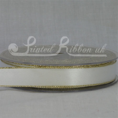 Beautiful 15mm (approx. 0.6 inch) wide Gold Lurex Edged, Double faced Satin woven ribbon on a 25 metre roll / reel. Ribbon Colour WHITE.