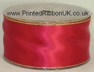 Beautiful 50mm (approx. 2 inch) wide Gold Lurex Edged, Double faced Satin woven ribbon on a 20 metre (21.8 yd) roll / reel. Ribbon Colour RED.