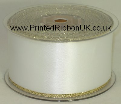 Beautiful 50mm (approx. 2 inch) wide Gold Lurex Edged, Double faced Satin woven ribbon on a 20 metre (21.8 yd) roll / reel. Ribbon Colour WHITE.
