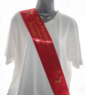 Design your own beautiful custom made, RED personalised printed sash suitable for corporate events, promotional events, hen nights, stag nights, beauty pageants, sporting events, parties, grand opening or launch events, sashes for corporate advertising, sashes for exhibitions, sashes for award evenings, sashes to promote / celebrate special occasions e.g. Birthdays and sashes for awareness or fundraising events etc.