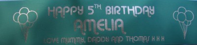 Fed up with low quality, unpersonalised and mass produced Birthday Party Banners?  Looking for something different that will be a keepsake for the special Birthday or occasion?  Well look no further why not design your own custom printed Birthday banner - your personalised message will be printed on to high quality single faced satin.  Use to decorate doors, tables and walls at your Birthday party venue.