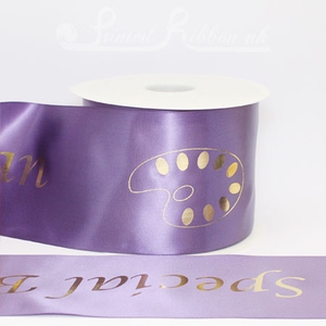 Roll of 50m of PURPLE 100mm (4 inch) wide high quality single faced personalised printed satin ribbon, printed one side. Create your very own custom printed, luxury personalised printed ribbon.