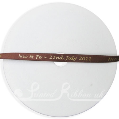 25m roll of 7mm BROWN double faced satin personalised printed wedding ribbon for your wedding favours to make your wedding day extra special with this bespoke ribbon. 7mm printed ribbon is the ideal width to wrap round the traditional 5cm square favour boxes and small organza bags or clear cellophane bags. Brides and Grooms or bridal couples can print their first names and the wedding date on the wedding ribbon. Alternatively, the printed wedding message could be “Mr & Mrs” followed by the surname and the wedding date. We can print any message and if you wish you can also print a motif from the selection below. Unlike other ribbon printers there is no set up or origination charge, no charge per letter or motif – everything is included in the price. Design your own personalised wedding ribbon easily, simply state the wedding message to be printed on to the ribbon, printing colour for text, your font choice and any motif. The maximum print height on 7mm ribbon is 3.5mm so we offer only the fonts and motifs that print most effectively on this narrow ribbon from our extensive printing experience. Fonts available are: Motifs available are:  |  |  |  |  |  | | #a. Outline Heart | #b. Solid Heart | #c. Entwined Hearts | #d. Wedding Rings | #e. Wedding Bells | #f. Swirly Heart |  |  |  |  |  |  | | #g. Champagne Glasses | #i. Outline Star | #j. Solid Star | #l. Fleur de Lys | #m. Flower | #o. Diamond | | YOUR LOGO | | #4. My own logo - email logo | The unprinted reverse side of this luxury ribbon is the same quality as the printed side which makes tying bows easy. Once the ribbon is ordered we prepare a print confirmation document incorporating a photo of your printed ribbon for you to review and approve before printing. If you have a specific printing requirement or spacing between prints just let us know. Orders can be placed here online or Contact us with details of your individual bespoke wedding ribbon and order over the telephone 01530 229 234 (8.00am to 8.00pm) as we accept payment by most major credit and debit cards. For a small extra charge we also offer a cut and heat sealing service to cut the printed wedding ribbon into specified lengths to save you time and give a professional finish. Contact us to order the printed ribbon and cutting service. If you require more than 25m printed ribbon see 50m personalised wedding ribbon section or for even more printed wedding ribbon contact us for a competitive quotation. The more you buy the more you save per metre! Need personalised wedding ribbon in a hurry? Contact us as we have ribbon in stock to print your custom wedding message on to it. However, if you require the ribbon in less than a week please choose Royal Mail Special Delivery for the P&P option when ordering online.