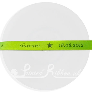 25m roll of 10mm LIME GREEN double faced satin personalised printed wedding ribbon for your wedding favours to make your wedding day extra special with this bespoke ribbon. 10mm printed ribbon is the ideal width to wrap round the traditional 5cm square favour boxes and small organza bags or clear cellophane bags. Brides and Grooms or bridal couples can print their first names and the wedding date on the wedding ribbon. Alternatively, the printed wedding message could be “Mr & Mrs” followed by the surname and the wedding date. We can print any message and if you wish you can also print a motif from the selection below. Unlike other ribbon printers there is no set up or origination charge, no charge per letter or motif – everything is included in the price. Design your own personalised wedding ribbon easily, simply state the wedding message to be printed on to the ribbon, printing colour for text, your font choice and any motif. The maximum print height on 10mm ribbon is 7mm so we offer only the fonts and motifs that print most effectively on this narrow ribbon from our extensive printing experience. Fonts available are: Motifs available are:  |  |  |  |  |  | | #a. Outline Heart | #b. Solid Heart | #c. Entwined Hearts | #d. Wedding Rings | #e. Wedding Bells | #f. Swirly Heart |  |  |  |  |  |  | | #g. Champagne Glasses | #i. Outline Star | #j. Solid Star | #k. Butterfly | #l. Fleur de Lys | #m. Flower |  | YOUR LOGO | | #o. Diamond | #4. My own logo - email logo | The unprinted reverse side of this luxury ribbon is the same quality as the printed side which makes tying bows easy. Once the ribbon is ordered we prepare a print confirmation document incorporating a photo of your printed ribbon for you to review and approve before printing. If you have a specific printing requirement or spacing between prints just let us know. Orders can be placed here online or Contact us with details of your individual bespoke wedding ribbon and order over the telephone 01530 229 234 (8.00am to 8.00pm) as we accept payment by most major credit and debit cards. For a small extra charge we also offer a cut and heat sealing service to cut the printed wedding ribbon into specified lengths to save you time and give a professional finish. Contact us to order the printed ribbon and cutting service. If you require more than 25m printed ribbon see 50m personalised wedding ribbon section or for even more printed wedding ribbon contact us for a competitive quotation. The more you buy the more you save per metre! Need personalised wedding ribbon in a hurry? Contact us as we have ribbon in stock to print your custom wedding message on to it. However, if you require the ribbon in less than a week please choose Royal Mail Special Delivery for the P&P option when ordering online.