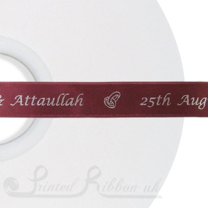 A 50m roll (approx) of BURGUNDY 15mm wide high quality double faced satin bespoke personalised ribbon. 15mm custom printed ribbon is ideal for wedding favours, Civil ceremonies, Christenings and Naming Days, Birthdays, Wedding Anniversaries, gifts for corporate clients or to add branding to your products etc. Our personalised ribbon looks lovely tied round favour boxes, party boxes, photo albums, invitations, jewellery boxes or organza bags to give that personal touch for your guests or clients. As the ribbon is woven edge double faced satin, the reverse side is the same quality as the printed side. Unlike other ribbon printers, no set up / origination or artwork charges apply. There is no maximum message print length, print as much (or little) as you like onto the ribbon. A motif, graphic or company logo, if required, is included in the price. If you require a larger print run than 50m for a function, event or custom printed ribbon for a business, please contact us for an individual competitive quotation. The more you buy the more you save per printed metre! Designing your own personalised ribbon - simply advise the message you want to be printed on the satin ribbon, the printing colour for text and your font choice. Most popular fonts are: If you have a particular company font or wedding font to be printed contact us with the details. You can choose one of our popular motifs below if you have something specific in mind let us know as we have an extensive graphics library. To print a company logo on the ribbon email us separately at info@printedribbonuk.co.uk a vector graphic or high resolution bitmap graphic i.e ai, eps, pdf, jpg, png, gif or tif file and, subject to it being suitable for printing, we will print this onto the ribbon for no extra charge. Most popular motif choices:  |  |  |  |  |  | | #a. Outline Heart | #b. Solid Heart | #c. Entwined Hearts | #d. Wedding Rings | #e. Wedding Bells | #f. Swirly Heart |  |  |  |  |  |  | | #g. Champagne Glasses | #h. Cocktail Glass | #i. Outline Star | #j. Solid Star | #k. Butterfly | #l. Fleur de Lys |  |  |  |  |  |  | | #m. Flower | #n. Flower with Heart | #o. Diamond | #p. Celtic Knot | #q. Tiara | #r. Crown |  |  |  |  |  |  | | #s. Football | #t. Musical Note | #u. Anchor | #v. Happy Skull and Cross Bones | #w. Balloons | #x. Birthday Age - state age eg #x18 |  |  |  |  |  | YOUR LOGO | | #y. Present | #z. Birthday Cupcake | #1. Holy Cross | #2. Teddy Bear | #3. Paw Print | #4. My own logo - email logo |