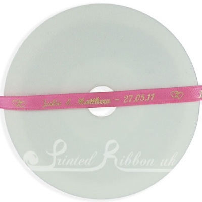 25m roll of 7mm HOT PINK double faced satin personalised printed wedding ribbon for your wedding favours to make your wedding day extra special with this bespoke ribbon. 7mm printed ribbon is the ideal width to wrap round the traditional 5cm square favour boxes and small organza bags or clear cellophane bags. Brides and Grooms or bridal couples can print their first names and the wedding date on the wedding ribbon. Alternatively, the printed wedding message could be “Mr & Mrs” followed by the surname and the wedding date. We can print any message and if you wish you can also print a motif from the selection below. Unlike other ribbon printers there is no set up or origination charge, no charge per letter or motif – everything is included in the price. Design your own personalised wedding ribbon easily, simply state the wedding message to be printed on to the ribbon, printing colour for text, your font choice and any motif. The maximum print height on 7mm ribbon is 3.5mm so we offer only the fonts and motifs that print most effectively on this narrow ribbon from our extensive printing experience. Fonts available are: Motifs available are:  |  |  |  |  |  | | #a. Outline Heart | #b. Solid Heart | #c. Entwined Hearts | #d. Wedding Rings | #e. Wedding Bells | #f. Swirly Heart |  |  |  |  |  |  | | #g. Champagne Glasses | #i. Outline Star | #j. Solid Star | #l. Fleur de Lys | #m. Flower | #o. Diamond | | YOUR LOGO | | #4. My own logo - email logo | The unprinted reverse side of this luxury ribbon is the same quality as the printed side which makes tying bows easy. Once the ribbon is ordered we prepare a print confirmation document incorporating a photo of your printed ribbon for you to review and approve before printing. If you have a specific printing requirement or spacing between prints just let us know. Orders can be placed here online or Contact us with details of your individual bespoke wedding ribbon and order over the telephone 01530 229 234 (8.00am to 8.00pm) as we accept payment by most major credit and debit cards. For a small extra charge we also offer a cut and heat sealing service to cut the printed wedding ribbon into specified lengths to save you time and give a professional finish. Contact us to order the printed ribbon and cutting service. If you require more than 25m printed ribbon see 50m personalised wedding ribbon section or for even more printed wedding ribbon contact us for a competitive quotation. The more you buy the more you save per metre! Need personalised wedding ribbon in a hurry? Contact us as we have ribbon in stock to print your custom wedding message on to it. However, if you require the ribbon in less than a week please choose Royal Mail Special Delivery for the P&P option when ordering online.