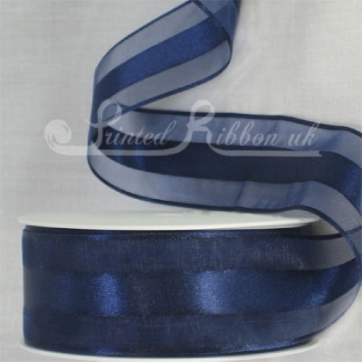 We are proud to supply this beautiful and rare 38mm (approx 1½ inch) wide NAVY BLUE sheer organza ribbon (organsa satin stripe ribbon) with approx 15mm wide double faced satin stripe running through the centre / middle and a satin border detail at the top and bottom.