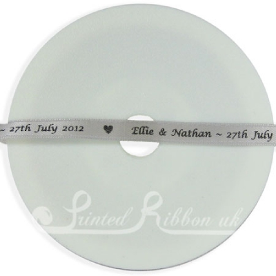 25m roll of 7mm SILVER double faced satin personalised printed wedding ribbon for your wedding favours to make your wedding day extra special with this bespoke ribbon. 7mm printed ribbon is the ideal width to wrap round the traditional 5cm square favour boxes and small organza bags or clear cellophane bags. Brides and Grooms or bridal couples can print their first names and the wedding date on the wedding ribbon. Alternatively, the printed wedding message could be “Mr & Mrs” followed by the surname and the wedding date. We can print any message and if you wish you can also print a motif from the selection below. Unlike other ribbon printers there is no set up or origination charge, no charge per letter or motif – everything is included in the price. Design your own personalised wedding ribbon easily, simply state the wedding message to be printed on to the ribbon, printing colour for text, your font choice and any motif. The maximum print height on 7mm ribbon is 3.5mm so we offer only the fonts and motifs that print most effectively on this narrow ribbon from our extensive printing experience. Fonts available are: Motifs available are:  |  |  |  |  |  | | #a. Outline Heart | #b. Solid Heart | #c. Entwined Hearts | #d. Wedding Rings | #e. Wedding Bells | #f. Swirly Heart |  |  |  |  |  |  | | #g. Champagne Glasses | #i. Outline Star | #j. Solid Star | #l. Fleur de Lys | #m. Flower | #o. Diamond | | YOUR LOGO | | #4. My own logo - email logo | The unprinted reverse side of this luxury ribbon is the same quality as the printed side which makes tying bows easy. Once the ribbon is ordered we prepare a print confirmation document incorporating a photo of your printed ribbon for you to review and approve before printing. If you have a specific printing requirement or spacing between prints just let us know. Orders can be placed here online or Contact us with details of your individual bespoke wedding ribbon and order over the telephone 01530 229 234 (8.00am to 8.00pm) as we accept payment by most major credit and debit cards. For a small extra charge we also offer a cut and heat sealing service to cut the printed wedding ribbon into specified lengths to save you time and give a professional finish. Contact us to order the printed ribbon and cutting service. If you require more than 25m printed ribbon see 50m personalised wedding ribbon section or for even more printed wedding ribbon contact us for a competitive quotation. The more you buy the more you save per metre! Need personalised wedding ribbon in a hurry? Contact us as we have ribbon in stock to print your custom wedding message on to it. However, if you require the ribbon in less than a week please choose Royal Mail Special Delivery for the P&P option when ordering online.