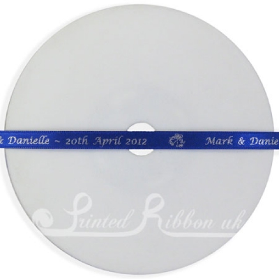 25m roll of 7mm ROYAL BLUE double faced satin personalised printed wedding ribbon for your wedding favours to make your wedding day extra special with this bespoke ribbon. 7mm printed ribbon is the ideal width to wrap round the traditional 5cm square favour boxes and small organza bags or clear cellophane bags. Brides and Grooms or bridal couples can print their first names and the wedding date on the wedding ribbon. Alternatively, the printed wedding message could be “Mr & Mrs” followed by the surname and the wedding date. We can print any message and if you wish you can also print a motif from the selection below. Unlike other ribbon printers there is no set up or origination charge, no charge per letter or motif – everything is included in the price. Design your own personalised wedding ribbon easily, simply state the wedding message to be printed on to the ribbon, printing colour for text, your font choice and any motif. The maximum print height on 7mm ribbon is 3.5mm so we offer only the fonts and motifs that print most effectively on this narrow ribbon from our extensive printing experience. Fonts available are: Motifs available are:  |  |  |  |  |  | | #a. Outline Heart | #b. Solid Heart | #c. Entwined Hearts | #d. Wedding Rings | #e. Wedding Bells | #f. Swirly Heart |  |  |  |  |  |  | | #g. Champagne Glasses | #i. Outline Star | #j. Solid Star | #l. Fleur de Lys | #m. Flower | #o. Diamond | | YOUR LOGO | | #4. My own logo - email logo | The unprinted reverse side of this luxury ribbon is the same quality as the printed side which makes tying bows easy. Once the ribbon is ordered we prepare a print confirmation document incorporating a photo of your printed ribbon for you to review and approve before printing. If you have a specific printing requirement or spacing between prints just let us know. Orders can be placed here online or Contact us with details of your individual bespoke wedding ribbon and order over the telephone 01530 229 234 (8.00am to 8.00pm) as we accept payment by most major credit and debit cards. For a small extra charge we also offer a cut and heat sealing service to cut the printed wedding ribbon into specified lengths to save you time and give a professional finish. Contact us to order the printed ribbon and cutting service. If you require more than 25m printed ribbon see 50m personalised wedding ribbon section or for even more printed wedding ribbon contact us for a competitive quotation. The more you buy the more you save per metre! Need personalised wedding ribbon in a hurry? Contact us as we have ribbon in stock to print your custom wedding message on to it. However, if you require the ribbon in less than a week please choose Royal Mail Special Delivery for the P&P option when ordering online.