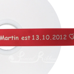 25mm custom printed ribbon is ideal for larger wedding favours, Civil ceremonies, Christenings and Naming Days, Birthdays, Wedding Anniversaries, gifts for corporate clients or to add branding to your products etc. Our personalised ribbon looks lovely tied round gift hampers, larger favour boxes, party boxes, photo albums, invitations, jewellery boxes or organza bags to give that personal touch for your guests or clients. As the ribbon is woven edge double faced satin, the reverse side is the same quality as the printed side. Unlike other ribbon printers, no set up / origination or artwork charges apply.