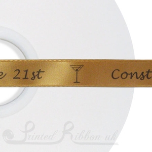 A 50m roll (approx) of GOLD 15mm wide high quality double faced satin bespoke personalised ribbon. 15mm custom printed ribbon is ideal for wedding favours, Civil ceremonies, Christenings and Naming Days, Birthdays, Wedding Anniversaries, gifts for corporate clients or to add branding to your products etc. Our personalised ribbon looks lovely tied round favour boxes, party boxes, photo albums, invitations, jewellery boxes or organza bags to give that personal touch for your guests or clients. As the ribbon is woven edge double faced satin, the reverse side is the same quality as the printed side. Unlike other ribbon printers, no set up / origination or artwork charges apply. There is no maximum message print length, print as much (or little) as you like onto the ribbon. A motif, graphic or company logo, if required, is included in the price. If you require a larger print run than 50m for a function, event or custom printed ribbon for a business, please contact us for an individual competitive quotation. The more you buy the more you save per printed metre! Designing your own personalised ribbon - simply advise the message you want to be printed on the satin ribbon, the printing colour for text and your font choice. Most popular fonts are: If you have a particular company font or wedding font to be printed contact us with the details. You can choose one of our popular motifs below if you have something specific in mind let us know as we have an extensive graphics library. To print a company logo on the ribbon email us separately at info@printedribbonuk.co.uk a vector graphic or high resolution bitmap graphic i.e ai, eps, pdf, jpg, png, gif or tif file and, subject to it being suitable for printing, we will print this onto the ribbon for no extra charge. Most popular motif choices:  |  |  |  |  |  | | #a. Outline Heart | #b. Solid Heart | #c. Entwined Hearts | #d. Wedding Rings | #e. Wedding Bells | #f. Swirly Heart |  |  |  |  |  |  | | #g. Champagne Glasses | #h. Cocktail Glass | #i. Outline Star | #j. Solid Star | #k. Butterfly | #l. Fleur de Lys |  |  |  |  |  |  | | #m. Flower | #n. Flower with Heart | #o. Diamond | #p. Celtic Knot | #q. Tiara | #r. Crown |  |  |  |  |  |  | | #s. Football | #t. Musical Note | #u. Anchor | #v. Happy Skull and Cross Bones | #w. Balloons | #x. Birthday Age - state age eg #x18 |  |  |  |  |  | YOUR LOGO | | #y. Present | #z. Birthday Cupcake | #1. Holy Cross | #2. Teddy Bear | #3. Paw Print | #4. My own logo - email logo |