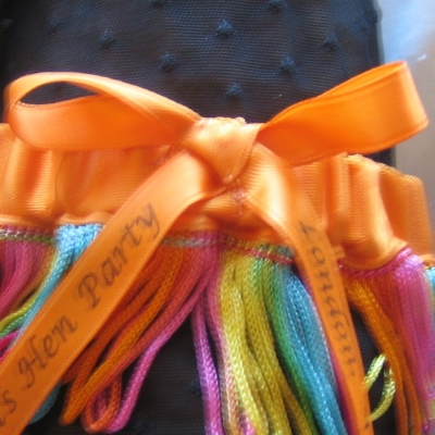 Be the “Talk of the Town” with this spectacular hand made hen night garter. Made with ORANGE quality double faced satin and a stunning multi coloured trim. For that final finishing touch that makes it stand out from the rest, a ribbon bow is added which can be personalised on the tails with one of the following A) TAIL 1 BRIDE’S NAME HENS ON TOUR TAIL 2 LOCATION AND DATE B) TAIL 1 BRIDE’S NAME HEN PARTY TAIL 2 LOCATION AND DATE Garters are available in the following sizes but if you require smaller or larger size please contact us. To ascertain size measure around thigh about 3 inches above knee. Sizes Small 11 - 15 inches (28cm - 38cm) Standard 12 - 16 inches (30cm – 41cm) Large 13 - 17 inches (33cm – 43cm) As these garters are made to order so please allow 7 – 10 days for delivery. If you need them urgently phone 07801 06 06 58. This stunning garter can be a keepsake for all your “hens” – a reminder of your wonderful celebratory hen night / hen weekend together.