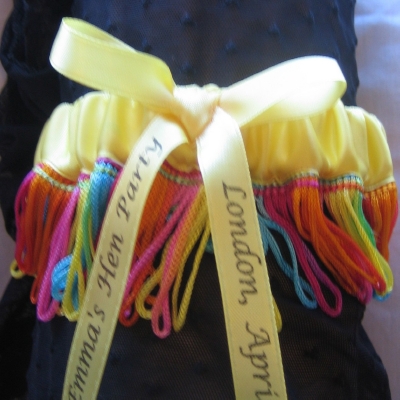> – Hen Night Garter hand made in YELLOW double faced satin and rainbow coloured trimming with personalised satin bow.