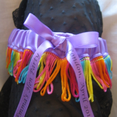 Be the “Talk of the Town” with this spectacular hand made hen night garter. Made with LIGHT PURPLE quality double faced satin and a stunning multi coloured trim. For that final finishing touch that makes it stand out from the rest, a ribbon bow is added which can be personalised on the tails with one of the following A) TAIL 1 BRIDE’S NAME HENS ON TOUR TAIL 2 LOCATION AND DATE B) TAIL 1 BRIDE’S NAME HEN PARTY TAIL 2 LOCATION AND DATE Garters are available in the following sizes but if you require smaller or larger size please contact us. To ascertain size measure around thigh about 3 inches above knee. Sizes Small 11 - 15 inches (28cm - 38cm) Standard 12 - 16 inches (30cm – 41cm) Large 13 - 17 inches (33cm – 43cm) As these garters are made to order so please allow 7 – 10 days for delivery. If you need them urgently phone 07801 06 06 58. This stunning garter can be a keepsake for all your “hens” – a reminder of your wonderful celebratory hen night / hen weekend together. .