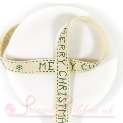 > 15mm Merry Christmas Ribbon with Green print, Herringbone style, 20m roll