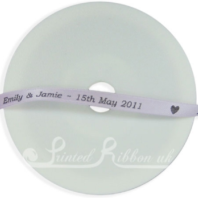25m roll of 7mm LILAC double faced satin personalised printed wedding ribbon for your wedding favours to make your wedding day extra special with this bespoke ribbon. 7mm printed ribbon is the ideal width to wrap round the traditional 5cm square favour boxes and small organza bags or clear cellophane bags.
