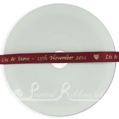 25m roll of 7mm MERLOT / DEEP BURGUNDY double faced satin personalised printed wedding ribbon for your wedding favours to make your wedding day extra special with this bespoke ribbon. 7mm printed ribbon is the ideal width to wrap round the traditional 5cm square favour boxes and small organza bags or clear cellophane bags.