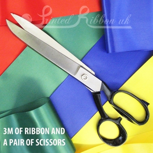 3m of 100mm wide, plain, single sided satin ribbon together with a pair of fabric cutting scissors ideal for launches and opening ceremonies.