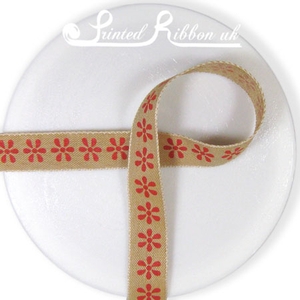 Ecru / Taupe / Light Brown 15mm ribbon with RED flower printed. 20m roll (PP15FLWR_RED20M) |