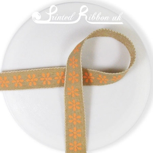 Ecru / Taupe / Light Brown 15mm ribbon with ORANGE flower printed. 20m roll (PP15FLWR_ORNG20M) |