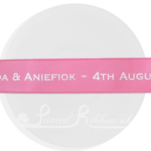 25mm custom printed ribbon is ideal for wedding favours, Civil ceremonies, Christenings, Birthdays, Wedding Anniversaries, gifts for corporate clients etc. Our bespoke printed ribbon looks lovely tied round favour boxes, party boxes, jewellery boxes or organza bags to give that personal touch for your guests or clients. As the ribbon is double faced satin, the reverse side is the same quality as the printed side. Unlike other ribbon printers, no set up / origination or artwork charges apply.