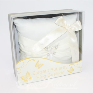 The middle of the pillow is decorated with a stylish, silver diamanti butterfly pin. The "tails" of the ribbon bow are printed in silver to add a luxurious personalised finishing touch. One "tail" is printed with the forenames of the Bride and Groom (or people getting married in a civil ceremony) and the second tail states the wedding date. Cascading from the middle of the wedding ring pillow are two sets of co-ordinating colour 3mm narrow ribbons to tie into a bow and hold the rings securely in place.