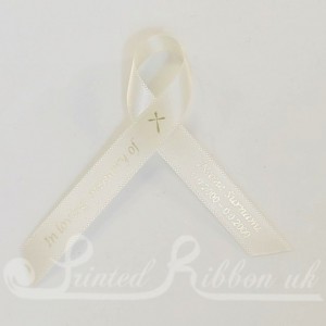 Pack of 10 personalised handmade CREAM funeral / memorial ribbons with safety pin attached to each one. Made to order from high quality double faced satin ribbon.